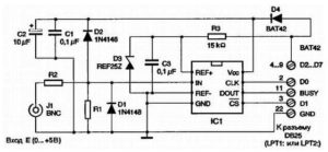 Эта схема является хорошим примером применения миниатюрных аналого-цифровых преобразователей с выводом информации в последовательном коде, рассмотренных в главе 2. Оригинальность схемы состоит в том, что опорное напряжение в ней составляет 2,5 В, а входное напряжение делится на 2 для получения полной шкалы устройства в 0–5 В. Подобная хитрость позволяет, кроме того, весьма эффективно и с малыми затратами защитить вход АЦП от перегрузок, а также обойтись для питания устройства напряжением около 5 В, получаемым от цепей информационных данных параллельного порта. Для этого на соответствующих выходах порта программно устанавливаются напряжения высокого логического уровня.