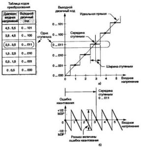 Совершенно очевидно, что в этом случае, так же как при любом другом процессе аналого-цифрового преобразования, полученный результат содержит некоторую ошибку, называемую ошибкой квантования. Причины ее возникновения поясняются в графике, приведенном на рис. 2.3 (б).