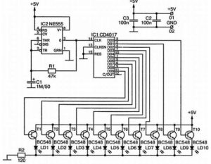 При подаче на вход счетчика IC1 непрерывной последовательности из десяти управляющих импульсов напряжение высокого логического уровня будет поочередно формироваться на выходах DO0-DО9, чем будут обеспечены последовательные вспышки светодиодов от LD10 до LD1. Если эти светодиоды расположить один возле другого, то, как уже отмечалось, благодаря инерции нашего зрения, создастся видимость того, что светящийся диод «бежит» по цепочке. После того как на вход счетчика будет подана следующая последовательность из десяти управляющих импульсов, произойдет повторный цикл поочередных вспышек светодиодов. И так будет продолжаться до отключения питания.