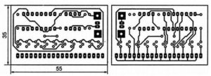 Все детали модуля бегущих огней размещены на небольшой двусторонней печатной плате размером 55×35 мм. Изображение печатной платы приведено на рис. 14.
