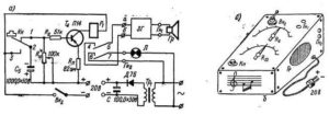 Сейчас на радиостудиях, в театрах, на стадионах применяются специальные электрозвуковые устройства, они служат для передачи позывных сигналов, сигналов-гонгов, воспроизведения боя часов и в других случаях. Устройства эти по своей конструкции (рис. 26, а) могут быть электронными и с электромеханическим механизмом. Датчиком для акустических сигналов может служить звуковой генератор, собранный по схеме симметричного мультивибратора на двух низкочастотных транзисторах одинаковой проводимости Т1 и Т2 типа П13—П16 (рис. 26, б). Для увеличения силы звукового сигнала подключен дополнительный усилительный каскад, собранный на транзисторе Т3 типа П4. Звуковой сигнал воспроизводится при помощи электродинамического громкоговорителя типа 0,15 ГД-ШМ-3, включенного в коллекторную цепь транзистора Т3.