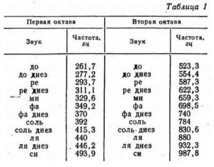 Все детали электронного камертона размещаются в небольшом пластмассовом корпусе, например от карманного приемника. На корпусе монтируются кнопка Кн и регулируемый резистор. Градуировка камертона производится при помощи лабораторного звукового генератора или частотомера в соответствии с табл. 1 от «ля» первой октавы до «соль» второй октавы.