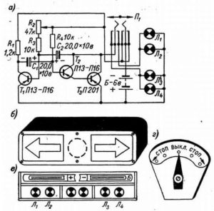 На выходе схемы попарно включаются четыре или шесть лампочек. Они монтируются в металлическом разделенном перегородками корпусе. Размеры корпуса подбираются произвольно (см. рис. 11, б). Одна из стенок корпуса делается из органического стекла. С внутренней стороны этой стенки укрепляется металлический или пластмассовый трафарет с изображением стрелок. На велосипеде между стрелками можно дополнительно поместить лампочки стоп-сигналы (см. рис. 11, в). В этом же корпусе монтируется мультивибратор. Впрочем, возможны и другие варианты оформления указателя поворотов. Например, можно установить два указателя поворотов — один впереди, другой сзади машины. Тогда у изображения стрелок электронного указателя поворотов монтируется только по одной лампе.