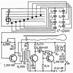 Эта установка позволяет исполнять простые музыкальные мелодии. Основой конструкции является панель, примененная в приборах для изучения музыкальной грамоты (см. рис. 22, а). Вместо нарисованных нотных знаков на панели укрепляются их металлические двойники, вырезанные из латуни или меди. Каждый из этих знаков соединен с конденсатором, включенным во входную цепь звукового генератора, собранного на транзисторе Т1. Таким образом, нотная линейка образует магазин емкостей. Вторым элементом управления музыкальной установки служит полоска-указка У с металлическим контактом на конце. Она является переключателем емкостей, а следовательно, и рабочей частоты генератора.